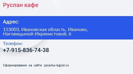 Руслан, кафе по адресу 153003, Ивановская область, Иваново, Наговицыной-Икрянистовой, 6 в дальнейшем Организация, размещена в следующих категориях: