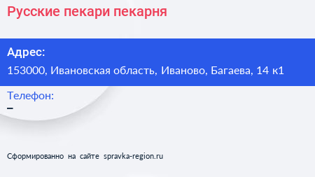 Русские пекари, пекарня по адресу 153000, Ивановская область, Иваново, Багаева, 14 к1 в дальнейшем Организация, размещена в следующих категориях: