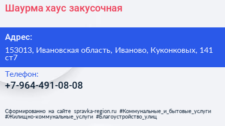 Шаурма хаус, закусочная по адресу 153013, Ивановская область, Иваново, Куконковых, 141 ст7 в дальнейшем Организация, размещена в следующих категориях:
