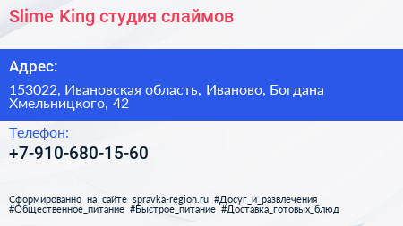 Slime King, студия слаймов по адресу 153022, Ивановская область, Иваново, Богдана Хмельницкого, 42 в дальнейшем Организация, размещена в следующих категориях: