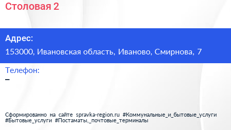Столовая №2 по адресу 153000, Ивановская область, Иваново, Смирнова, 7 в дальнейшем Организация, размещена в следующих категориях: