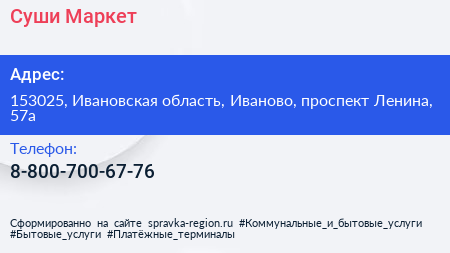 Суши-Маркет по адресу 153025, Ивановская область, Иваново, проспект Ленина, 57а в дальнейшем Организация, размещена в следующих категориях: