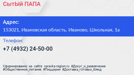 СытЫй ПАПА по адресу 153021, Ивановская область, Иваново, Школьная, 1а в дальнейшем Организация, размещена в следующих категориях: