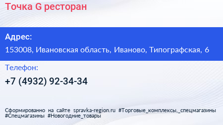 Точка G, ресторан по адресу 153008, Ивановская область, Иваново, Типографская, 6 в дальнейшем Организация, размещена в следующих категориях: