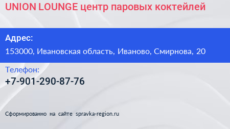 UNION LOUNGE, центр паровых коктейлей по адресу 153000, Ивановская область, Иваново, Смирнова, 20 в дальнейшем Организация, размещена в следующих категориях: