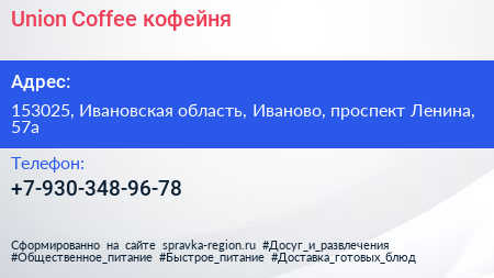 Union Coffee, кофейня по адресу 153025, Ивановская область, Иваново, проспект Ленина, 57а в дальнейшем Организация, размещена в следующих категориях: