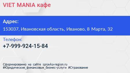 VIET MANIA, кафе по адресу 153037, Ивановская область, Иваново, 8 Марта, 32 в дальнейшем Организация, размещена в следующих категориях: