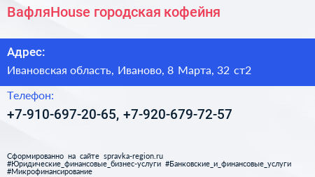 ВафляHouse, городская кофейня по адресу Ивановская область, Иваново, 8 Марта, 32 ст2 в дальнейшем Организация, размещена в следующих категориях:
