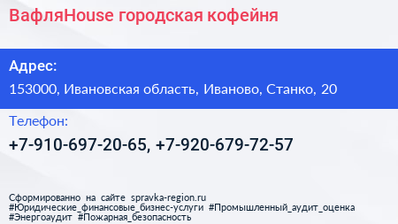 ВафляHouse, городская кофейня по адресу 153000, Ивановская область, Иваново, Станко, 20 в дальнейшем Организация, размещена в следующих категориях: