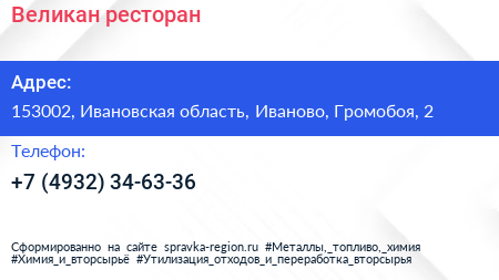 Великан, ресторан по адресу 153002, Ивановская область, Иваново, Громобоя, 2 в дальнейшем Организация, размещена в следующих категориях: