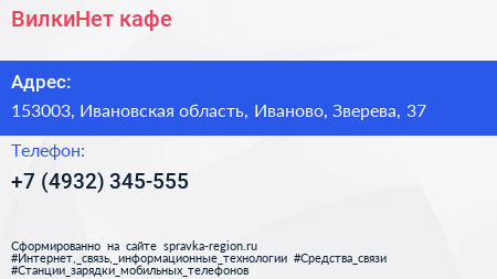 ВилкиНет, кафе по адресу 153003, Ивановская область, Иваново, Зверева, 37 в дальнейшем Организация, размещена в следующих категориях: