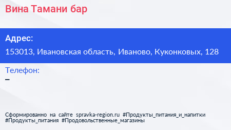 Вина Тамани, бар по адресу 153013, Ивановская область, Иваново, Куконковых, 128 в дальнейшем Организация, размещена в следующих категориях: