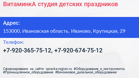 ВитаминкА, студия детских праздников по адресу 153000, Ивановская область, Иваново, Крутицкая, 29 в дальнейшем Организация, размещена в следующих категориях: