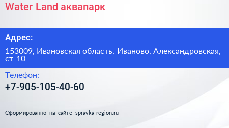 Water Land, аквапарк по адресу 153009, Ивановская область, Иваново, Александровская, ст 10 в дальнейшем Организация, размещена в следующих категориях: