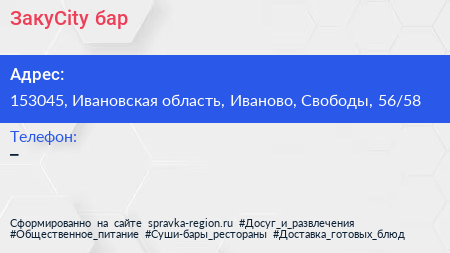 ЗакуCity, бар по адресу 153045, Ивановская область, Иваново, Свободы, 56/58 в дальнейшем Организация, размещена в следующих категориях: