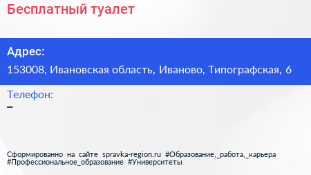 Бесплатный туалет по адресу 153008, Ивановская область, Иваново, Типографская, 6 в дальнейшем Организация, размещена в следующих категориях: