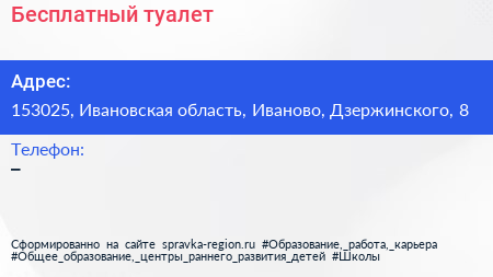 Бесплатный туалет по адресу 153025, Ивановская область, Иваново, Дзержинского, 8 в дальнейшем Организация, размещена в следующих категориях: