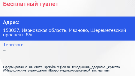 Бесплатный туалет по адресу 153037, Ивановская область, Иваново, Шереметевский проспект, 85г в дальнейшем Организация, размещена в следующих категориях: