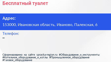 Бесплатный туалет по адресу 153000, Ивановская область, Иваново, Палехская, 6 в дальнейшем Организация, размещена в следующих категориях: