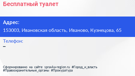 Бесплатный туалет по адресу 153003, Ивановская область, Иваново, Кузнецова, 65 в дальнейшем Организация, размещена в следующих категориях:
