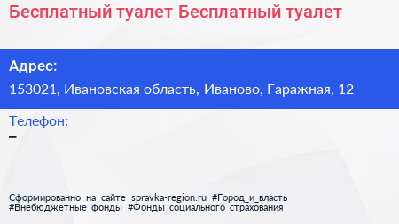 Бесплатный туалет, Бесплатный туалет по адресу 153021, Ивановская область, Иваново, Гаражная, 12 в дальнейшем Организация, размещена в следующих категориях: