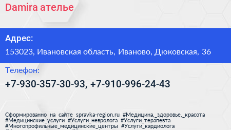 Damira, ателье по адресу 153023, Ивановская область, Иваново, Дюковская, 36 в дальнейшем Организация, размещена в следующих категориях: