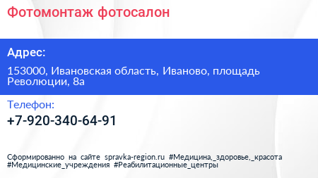 Фотомонтаж, фотосалон по адресу 153000, Ивановская область, Иваново, площадь Революции, 8а в дальнейшем Организация, размещена в следующих категориях: