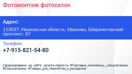 Фотомонтаж, фотосалон по адресу 153037, Ивановская область, Иваново, Шереметевский проспект, 87 в дальнейшем Организация, размещена в следующих категориях: