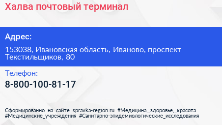 Халва, почтовый терминал по адресу 153038, Ивановская область, Иваново, проспект Текстильщиков, 80 в дальнейшем Организация, размещена в следующих категориях:
