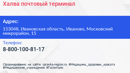 Халва, почтовый терминал по адресу 153048, Ивановская область, Иваново, Московский микрорайон, 15 в дальнейшем Организация, размещена в следующих категориях: