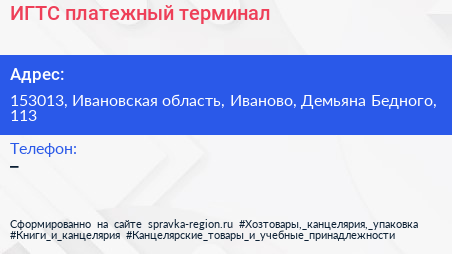 ИГТС, платежный терминал по адресу 153013, Ивановская область, Иваново, Демьяна Бедного, 113 в дальнейшем Организация, размещена в следующих категориях: