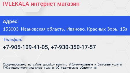 IVLEKALA, интернет-магазин по адресу 153003, Ивановская область, Иваново, Красных Зорь, 15а в дальнейшем Организация, размещена в следующих категориях: