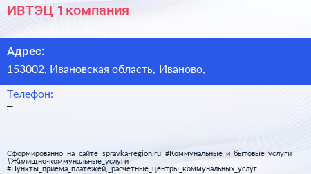 ИВТЭЦ-1, компания по адресу 153002, Ивановская область, Иваново, в дальнейшем Организация, размещена в следующих категориях: