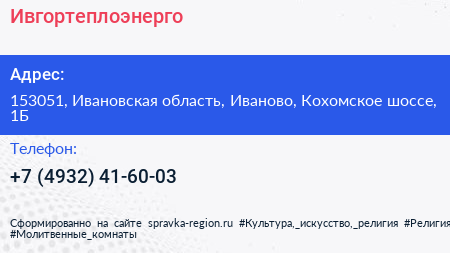 Ивгортеплоэнерго по адресу 153051, Ивановская область, Иваново, Кохомское шоссе, 1Б в дальнейшем Организация, размещена в следующих категориях: