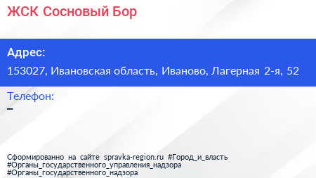 ЖСК Сосновый Бор по адресу 153027, Ивановская область, Иваново, Лагерная 2-я, 52 в дальнейшем Организация, размещена в следующих категориях: