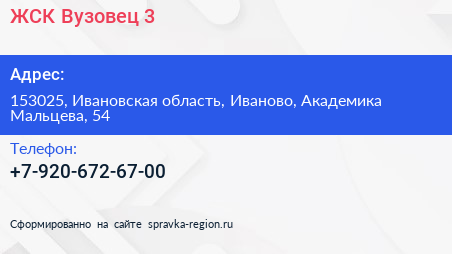 ЖСК Вузовец-3 по адресу 153025, Ивановская область, Иваново, Академика Мальцева, 54 в дальнейшем Организация, размещена в следующих категориях: