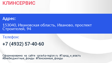 КЛИНСЕРВИС по адресу 153040, Ивановская область, Иваново, проспект Строителей, 94 в дальнейшем Организация, размещена в следующих категориях: