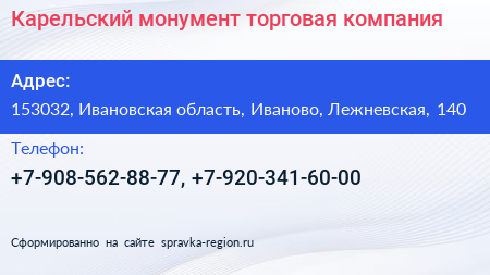 Карельский монумент, торговая компания по адресу 153032, Ивановская область, Иваново, Лежневская, 140 в дальнейшем Организация, размещена в следующих категориях: