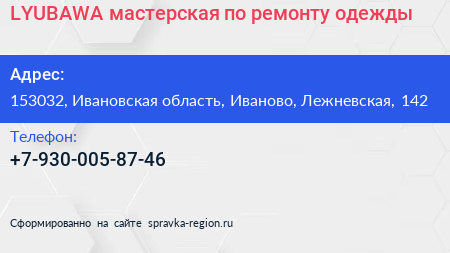 LYUBAWA, мастерская по ремонту одежды по адресу 153032, Ивановская область, Иваново, Лежневская, 142 в дальнейшем Организация, размещена в следующих категориях: