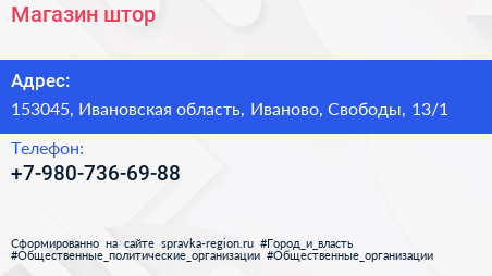 Магазин штор по адресу 153045, Ивановская область, Иваново, Свободы, 13/1 в дальнейшем Организация, размещена в следующих категориях: