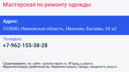 Мастерская по ремонту одежды по адресу 153000, Ивановская область, Иваново, Багаева, 14 к2 в дальнейшем Организация, размещена в следующих категориях: