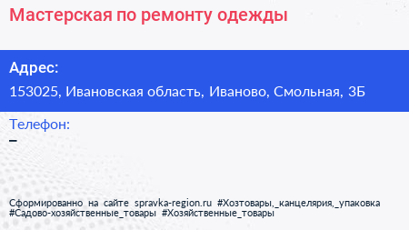 Мастерская по ремонту одежды по адресу 153025, Ивановская область, Иваново, Смольная, 3Б в дальнейшем Организация, размещена в следующих категориях: