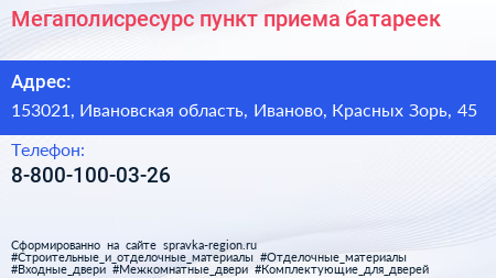 Мегаполисресурс, пункт приема батареек по адресу 153021, Ивановская область, Иваново, Красных Зорь, 45 в дальнейшем Организация, размещена в следующих категориях: