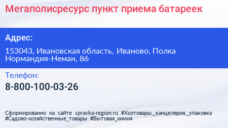 Мегаполисресурс, пункт приема батареек по адресу 153043, Ивановская область, Иваново, Полка Нормандия-Неман, 86 в дальнейшем Организация, размещена в следующих категориях: