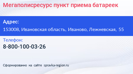 Мегаполисресурс, пункт приема батареек по адресу 153008, Ивановская область, Иваново, Лежневская, 55 в дальнейшем Организация, размещена в следующих категориях: