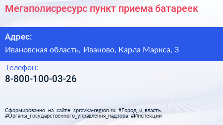 Мегаполисресурс, пункт приема батареек по адресу Ивановская область, Иваново, Карла Маркса, 3 в дальнейшем Организация, размещена в следующих категориях: