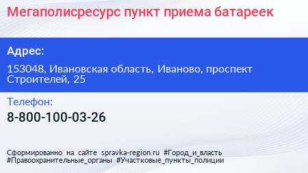 Мегаполисресурс, пункт приема батареек по адресу 153048, Ивановская область, Иваново, проспект Строителей, 25 в дальнейшем Организация, размещена в следующих категориях: