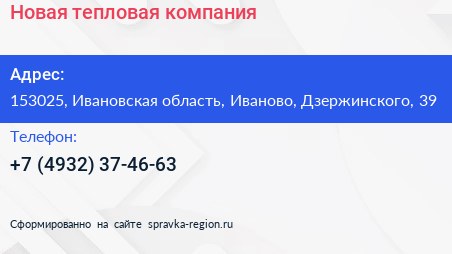 Новая тепловая компания по адресу 153025, Ивановская область, Иваново, Дзержинского, 39 в дальнейшем Организация, размещена в следующих категориях: