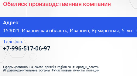 Обелиск, производственная компания по адресу 153021, Ивановская область, Иваново, Ярмарочная, 5 лит 5 в дальнейшем Организация, размещена в следующих категориях: