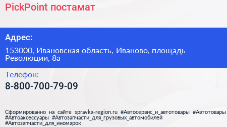 PickPoint, постамат по адресу 153000, Ивановская область, Иваново, площадь Революции, 8а в дальнейшем Организация, размещена в следующих категориях: